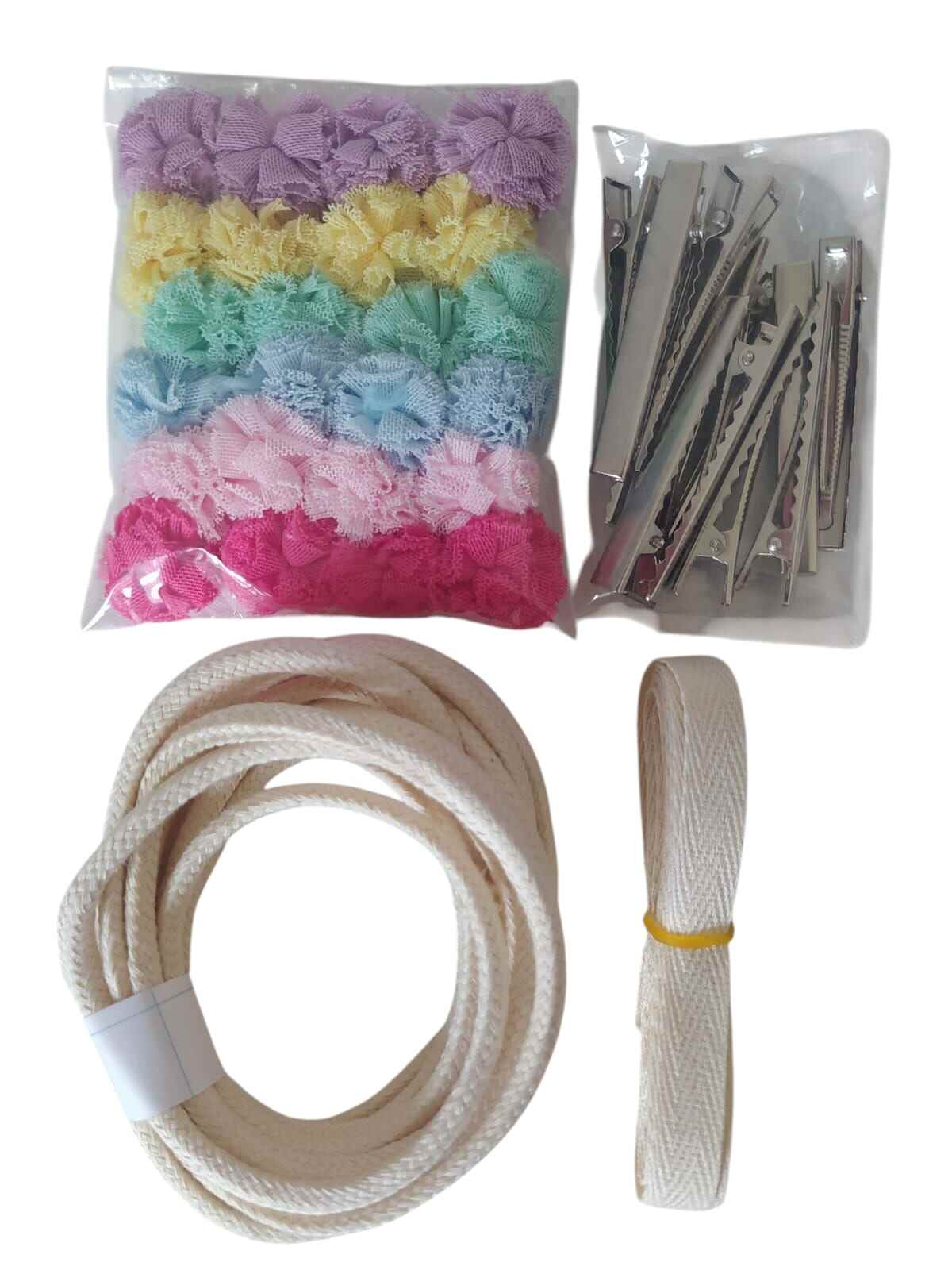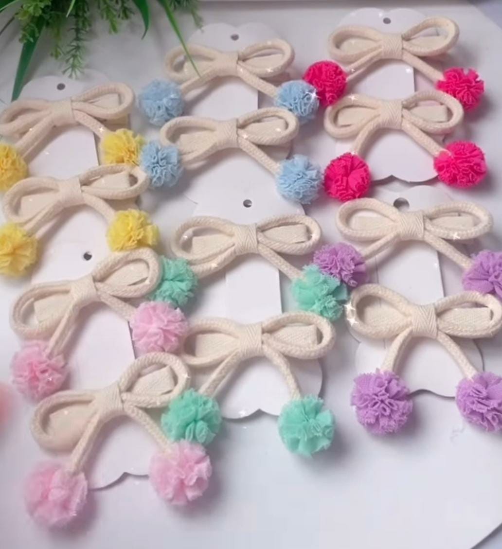 O kit contém:24 pompons de malha 2,5cm2,30cm de fita sarjada 10mm3,20cm de cordão algodão12 Bicos de Pato Jacaré 5,5*tem vídeo no nosso instagram ensinando montar